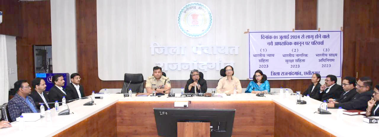 प्रधान जिला एवं सत्र न्यायाधीश श्रीमती सुषमा सावंत ने जिला पंचायत के सभाकक्ष में 1 जुलाई 2024 से लागू होने वाले नये अपराधिक कानूनों के संबंध में न्यायाधीशों, राजस्व, पुलिस प्रशासन एवं अधिवक्तागणों को जानकारी दी। इस दौरान कलेक्टर श्री संजय अग्रवाल, पुलिस अधीक्षक श्री मोहित गर्ग उपस्थित थे। प्रधान जिला एवं सत्र न्यायाधीश श्रीमती सुषमा सावंत ने कहा कि एक जुलाई से भारतीय न्याय संहिता 2023, भारतीय नागरिक सुरक्षा संहिता 2023, भारतीय साक्ष्य अधिनियम 2023 प्रभावी होंगे। उन्होंने कहा कि नये कानून वर्तमान परिप्रेक्ष्य में सरल करने के लिए लाया गया है। नये तीनों कानून, न्याय और नागरिक सुरक्षा के लिए लाए गए हैं। उन्होंने कहा कि नये कानून के साथ हम सकारात्मक दृष्टिकोण के साथ आगे बढ़ेगे तो ज्यादा बेहतर काम कर पाएंगे। उन्होंने 1 जुलाई से लागू होने वाले नये आपराधिक कानून के संबंध में विस्तार से जानकारी दी।