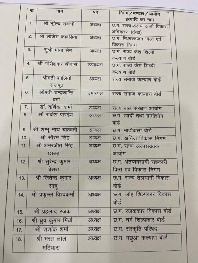 छत्तीसगढ़ में निगम, मंडल और आयोगों के रिक्त पदों पर बुधवार को देर रात नियुक्ति कर दी गई है। जिन नेताओं को निगम, मंडल और आयोगों की कमान सौंपी गई है, उनमें बस्तर से राजधानी होकर सरगुजा तक के नेता शामिल हैं।