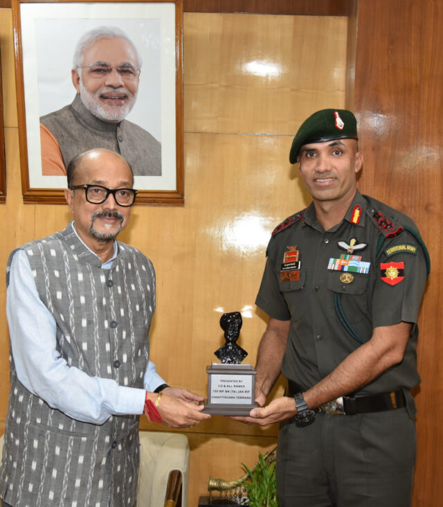 Home छत्तीसगढ़ राज्यपाल श्री डेका से छत्तीसगढ़ टेरियर्स के कमांडिंग ऑफिसर ने सौजन्य भेंट... छत्तीसगढ़रायपुर राज्यपाल श्री डेका से छत्तीसगढ़ टेरियर्स के कमांडिंग ऑफिसर ने सौजन्य भेंट की By NEWSDESK - May 19, 2025 22 0 FacebookTwitterPinterestWhatsApp रायपुर राज्यपाल श्री रमेन डेका से आज यहां राजभवन में 155 इन्फैंट्री बटालियन जम्मू-कश्मीर राइफल्स (छत्तीसगढ़ टेरियर्स) नवा रायपुर के कमाडिंग ऑफिसर कर्नल राज कुमार ने सौजन्य भेंट की।