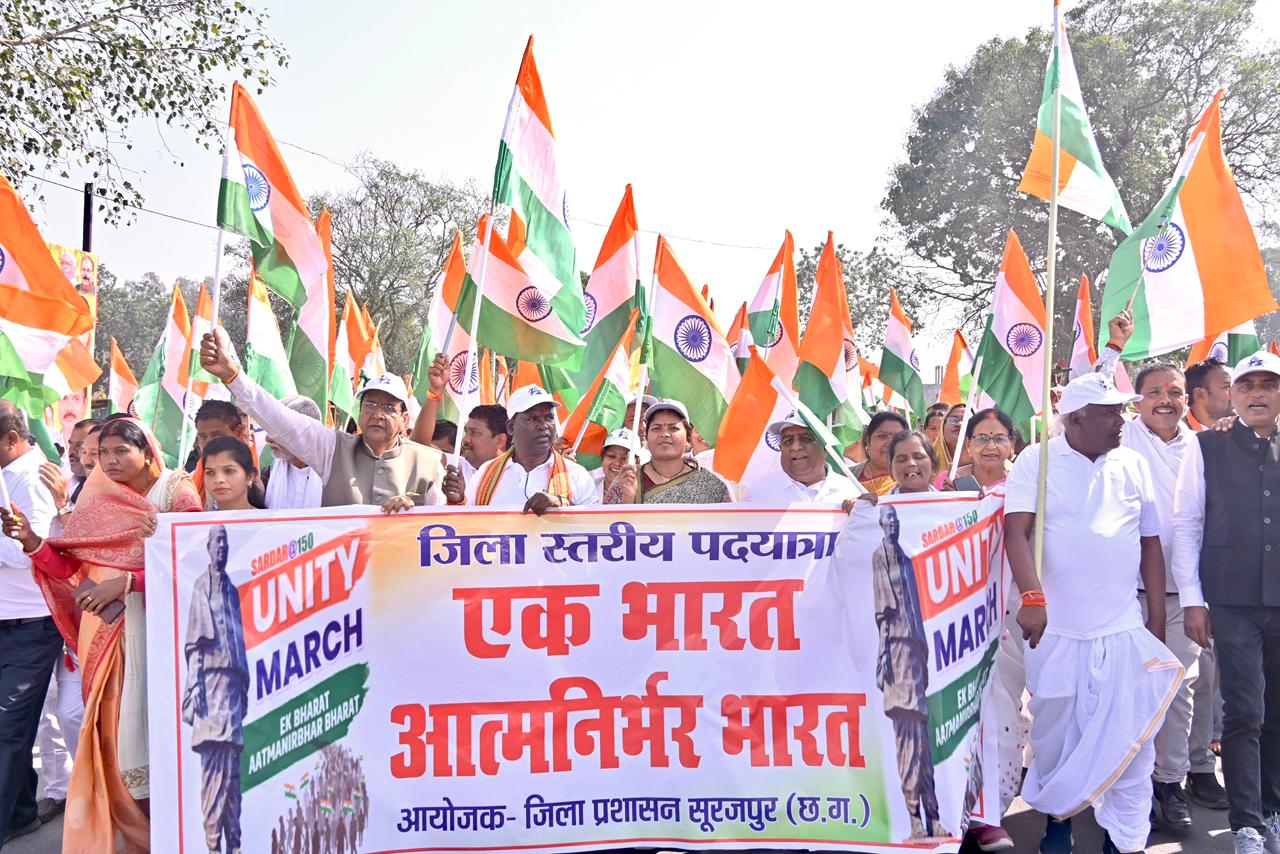 अखंड भारत के शिल्पकार लौह पुरुष सरदार वल्लभभाई पटेल की 150वीं जयंती के अवसर पर सूरजपुर में आज भव्य “यूनिटी मार्च” का आयोजन किया गया।जिसमें महिला एवं बाल विकास मंत्री श्रीमती लक्ष्मी राजवाड़े ने सम्मिलित होकर लोगों का उत्साह बढ़ाया। मंत्री श्रीमती राजवाड़े ने कहा कि छत्तीसगढ़ राज्य अपना रजत जयंती वर्ष मना रहा है और इसी दौरान सरदार वल्लभभाई पटेल की 150वीं जयंती मनाना राष्ट्र के प्रति गर्व और कृतज्ञता का अवसर है। उन्होंने कहा कि सरदार पटेल ने 565 रियासतों का एकीकरण कर अखंड भारत की नींव रखी।सरदार पटेल का जीवन राष्ट्रनिष्ठा का सर्वाेत्तम उदाहरण है। त्याग, सेवा और राष्ट्रहित को सर्वाेपरि रखने की उनकी सोच सदैव प्रेरणा देती रहेगी।