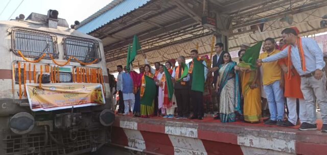 राज्य सरकार की रामलला दर्शन योजना के तहत आज बिलासपुर रेलवे स्टेशन से भारत गौरव स्पेशल ट्रेन बिलासपुर संभाग के समस्त जिलों के 850 तीर्थयात्रियों को लेकर अयोध्या धाम के लिए रवाना हुई। इस यात्रा के दौरान यात्रियों को वाराणसी में काशी विश्वनाथ जी के दर्शन का लाभ भी मिलेगा। भारत गौरव स्पेशल ट्रेन को बिल्हा विधायक श्री धरमलाल कौशिक, बेलतरा विधायक श्री सुशांत शुक्ला, महापौर बिलासपुर श्रीमती पूजा विधानी एवं सुश्री हर्षिता पांडे ने हरी झंडी दिखाकर रवाना किया। स्पेशल ट्रेन के रवाना होने के पूर्व अतिथियों ने तीर्थयात्रियों का फूलमालाओं से स्वागत व अभिनंदन किया।