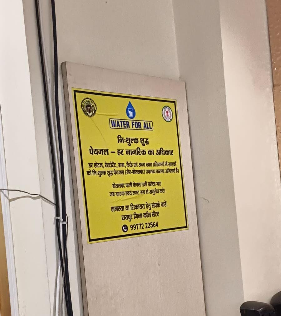 रायपुर 25 फरवरी 2026 / मुख्यमंत्री विष्णु देव साय के निर्देशन एवं कलेक्टर डॉ. गौरव सिंह के मार्गदर्शन में जिला प्रशासन द्वारा “Water for All” अभियान के अंतर्गत जिले के समस्त होटल, रेस्टोरेंट, ढाबा एवं अन्य खाद्य प्रतिष्ठानों में नागरिकों को निःशुल्क शुद्ध पेयजल उपलब्ध कराए जाने हेतु नियमित मॉनिटरिंग की जा रही है।.