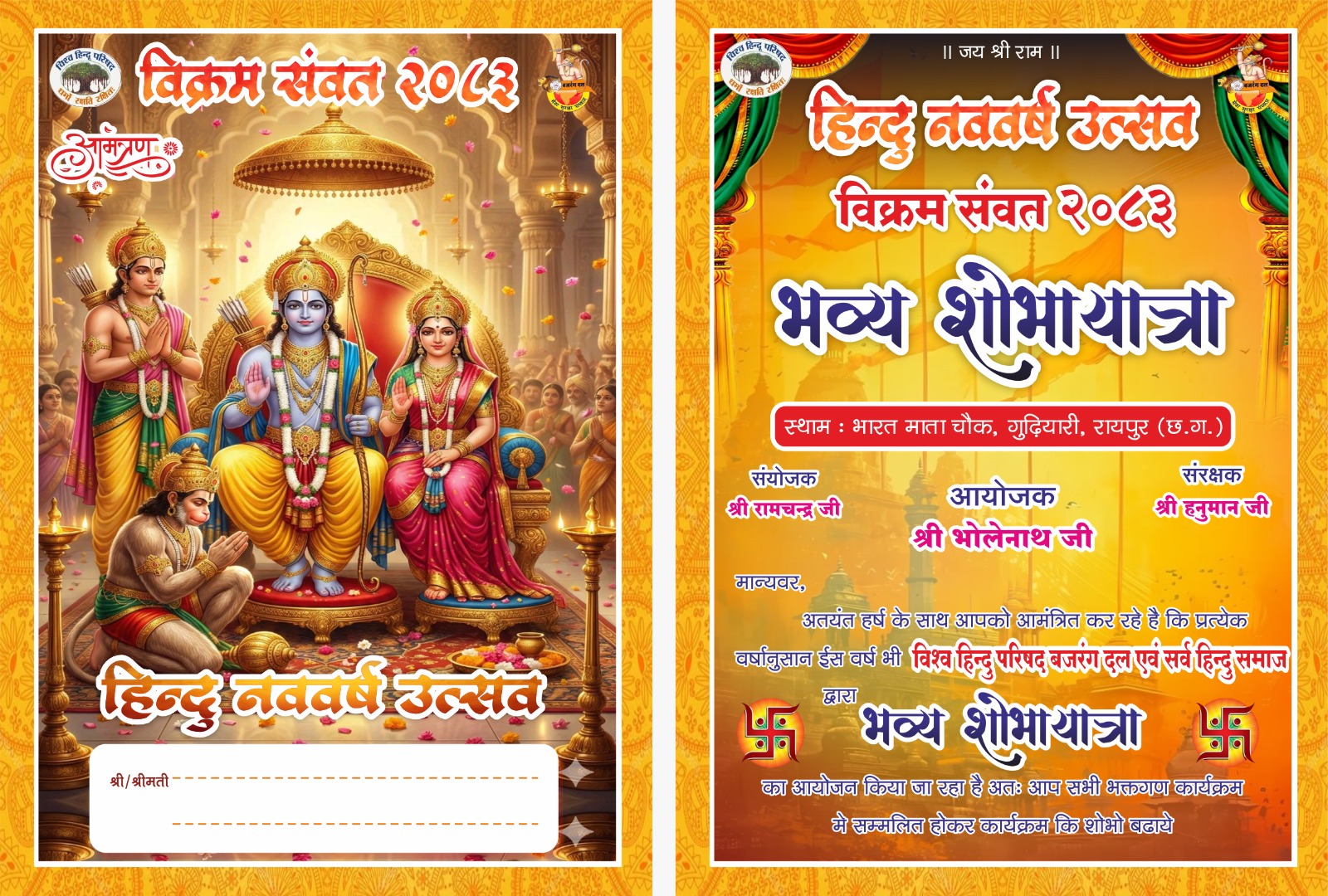 शोभायात्रा 22 मार्च दिन रविवार को शाम 6 बजे गुड़ियारी भारत माता चौक से प्रारम्भ होकर खलबाड़ा पहाड़ी चौक होते हुए महतारी चौक मे बड़े धूम धाम से समापन होगा